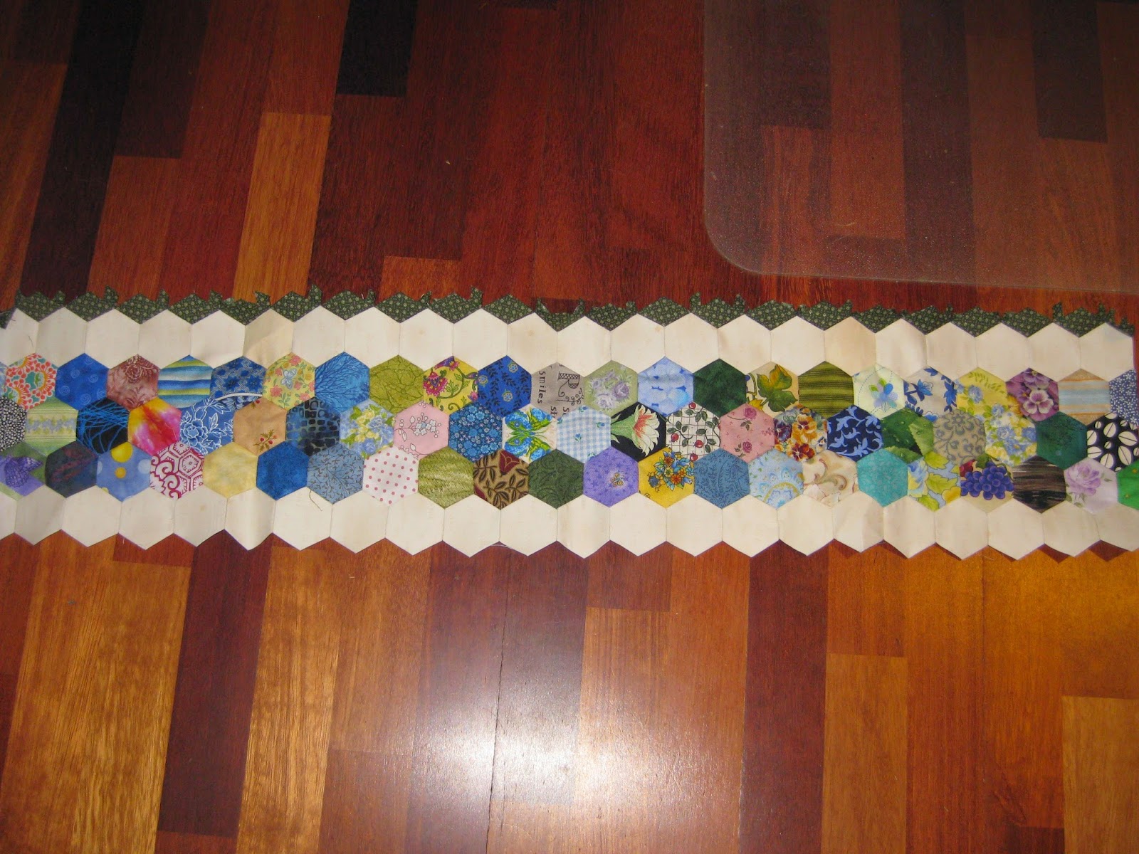 This is the first panel of the centre of Miss Elizabeth. I am very happy with the way it looks despite the fact that there are blue hexies next to blue hexies. I have already got the next panel done and the diamonds that join the two together are in place. It is going to be a very time consuming quilt but I do love it and work on it any spare moment. Great way to use up scraps ... and thanks to Rosalie for some of hers!